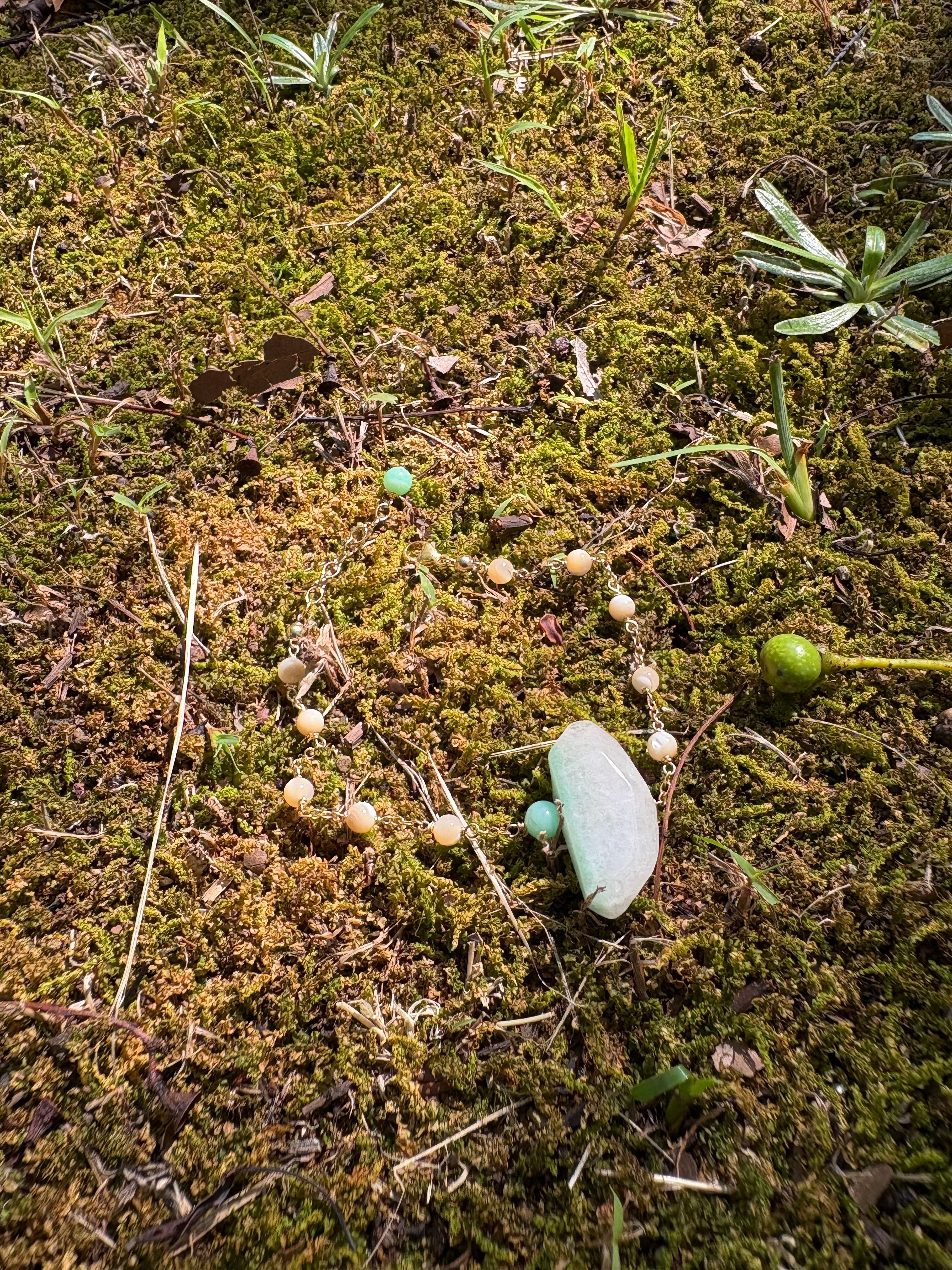 丸い粒はこっくりとしたお色のマザーオブパールです、グリーンアベンチュリンの隣りの丸い鮮やかな石は、クリソプレーズ