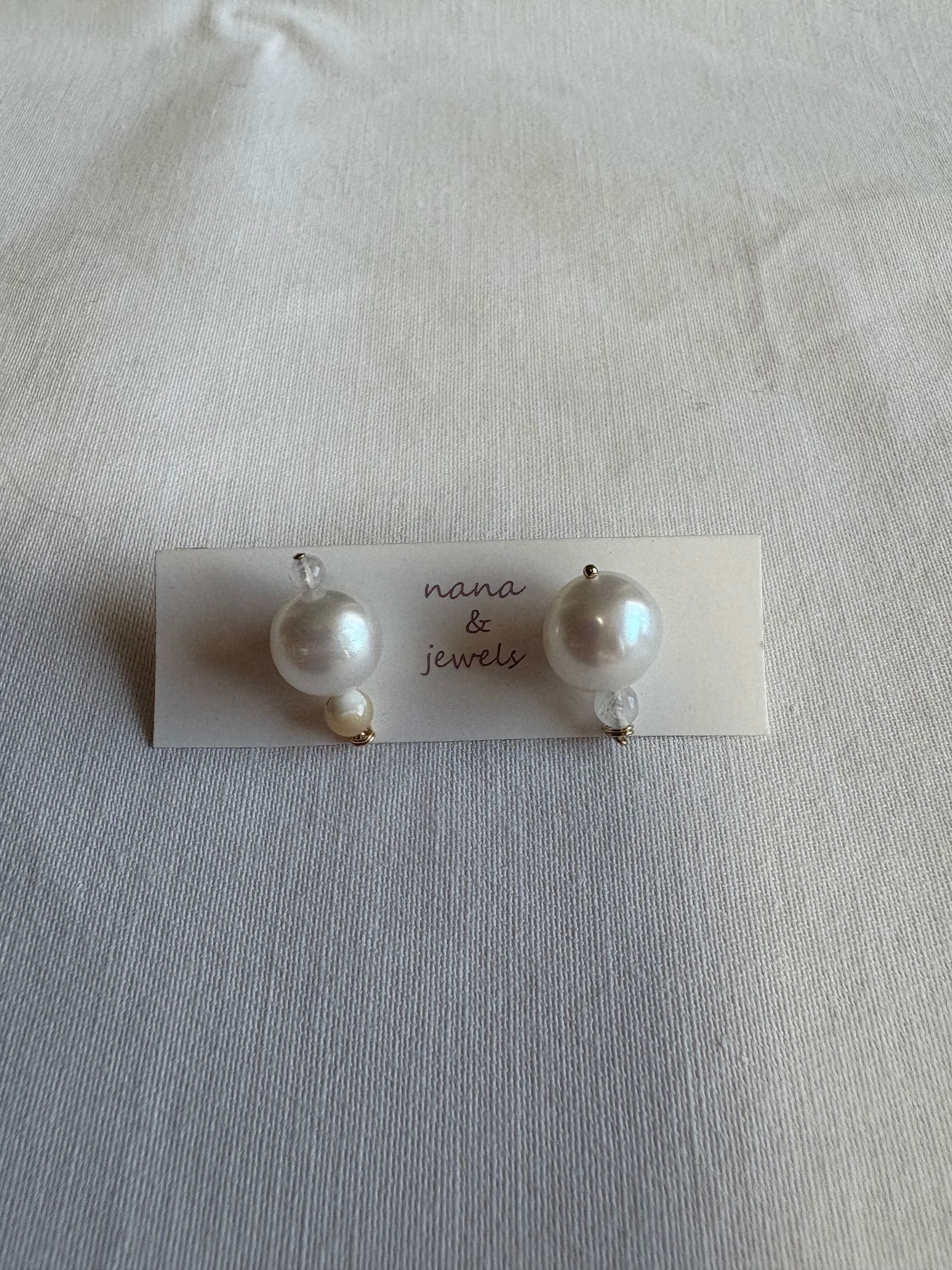ころっとした淡水パールに、小さなマザーオブパール、ムーンストーンを使用した14kgfポストピアスです。