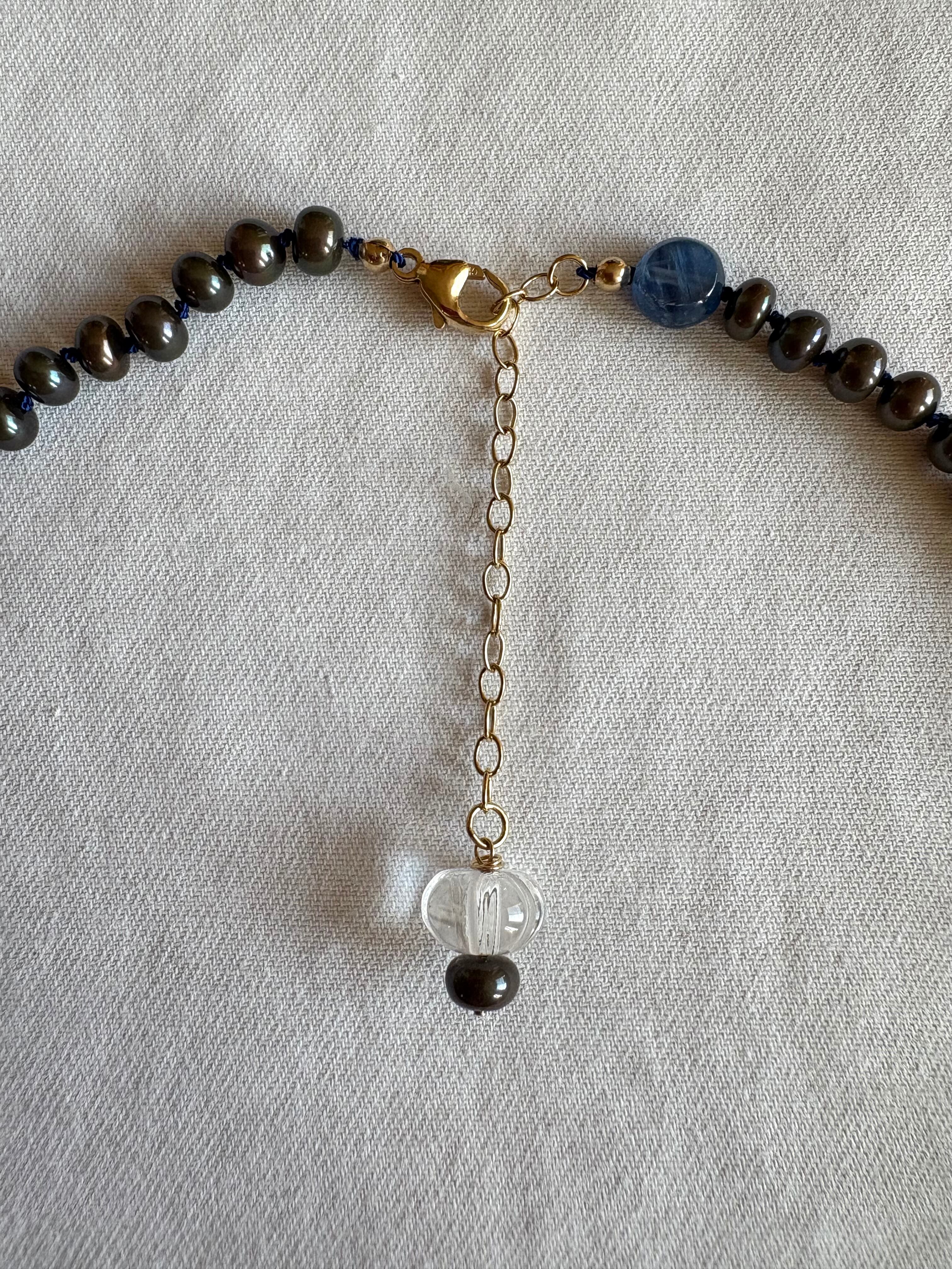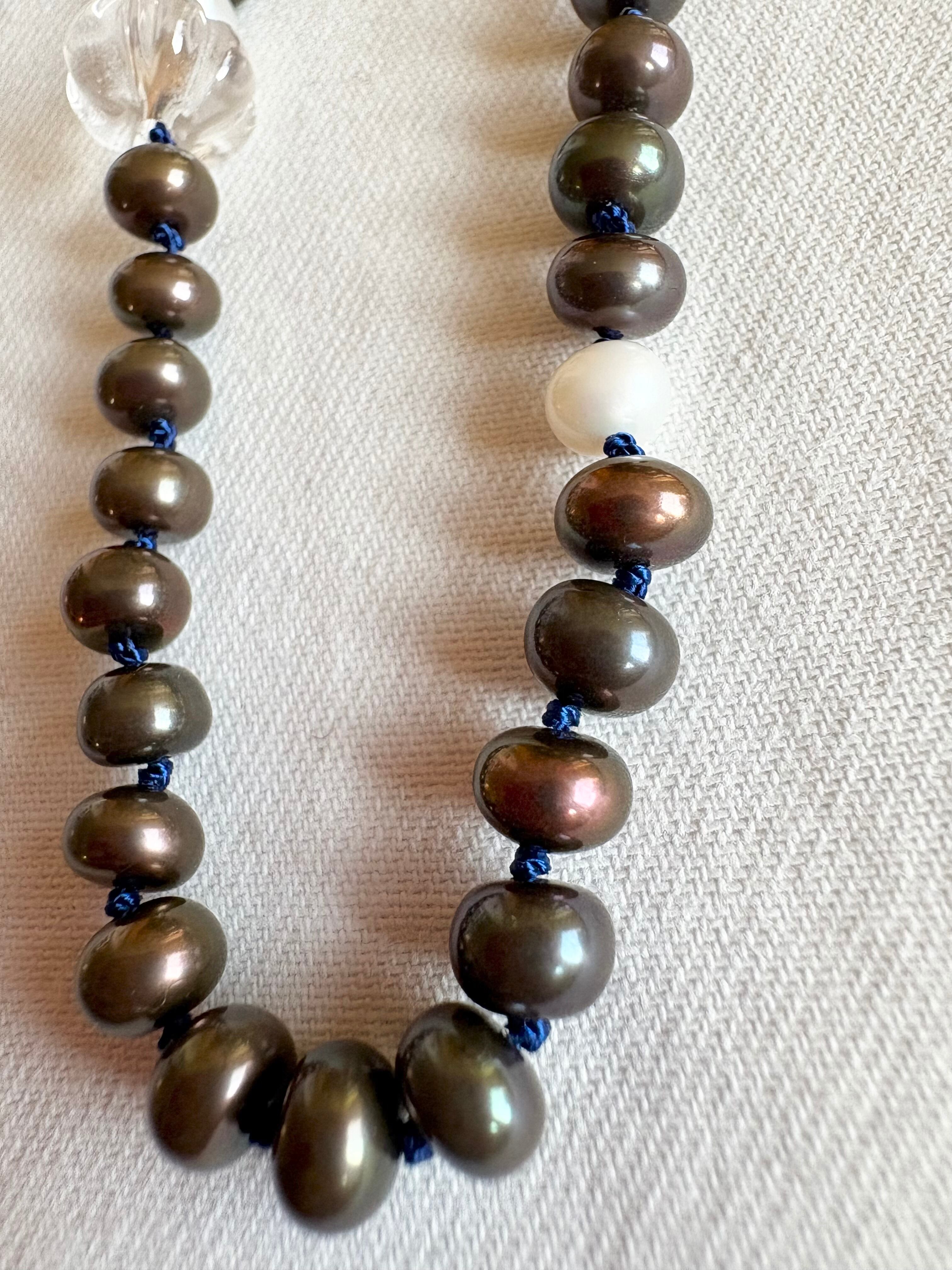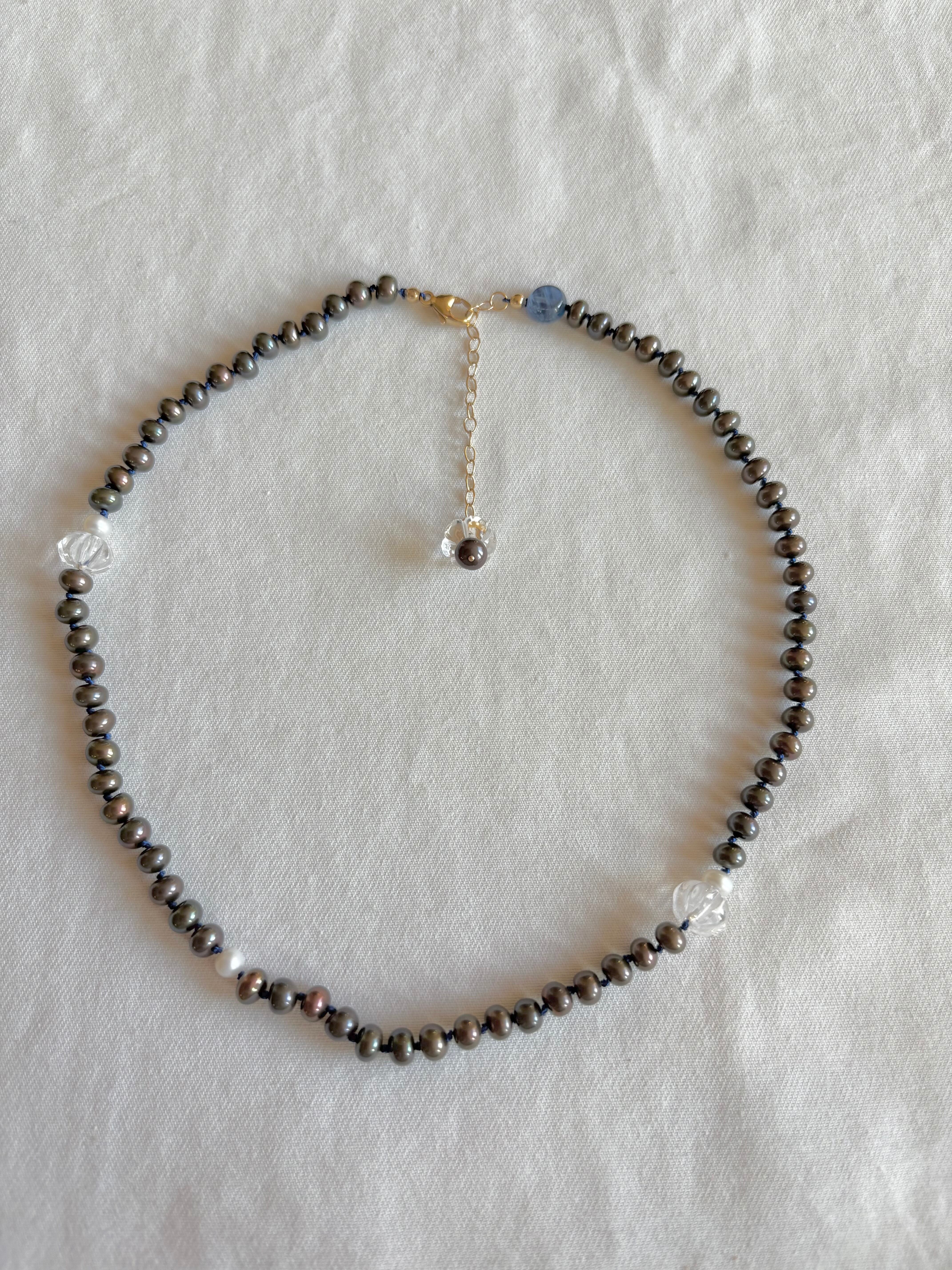 紺色のシルク糸でひと粒ひと粒結んで繋げています、紺色がアクセントになります